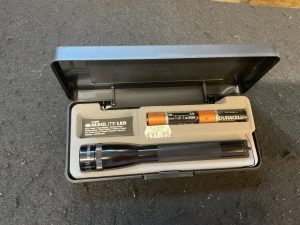 Drinking cups, Maglite torch, certificate holder, gun sock and compass.
