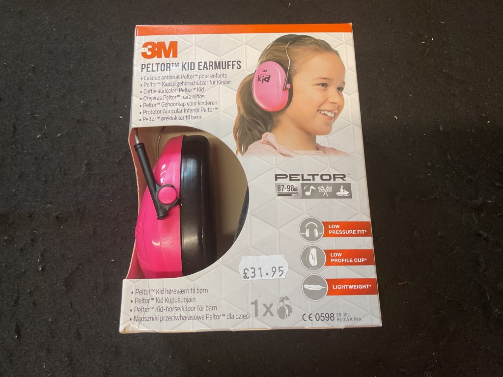 Children’s ear protectors available in green and pink.